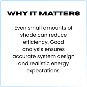 Shade plays a major role in how much energy your solar system can produce. Trees, chimneys, neighboring homes, and utility structures can all reduce sunlight exposure. Professional installers use satellite imagery and on-site shade analysis tools to measure how much sunlight your roof receives throughout the year. These evaluations help determine how much energy your system can realistically generate and whether adjustments or tree trimming might be needed.